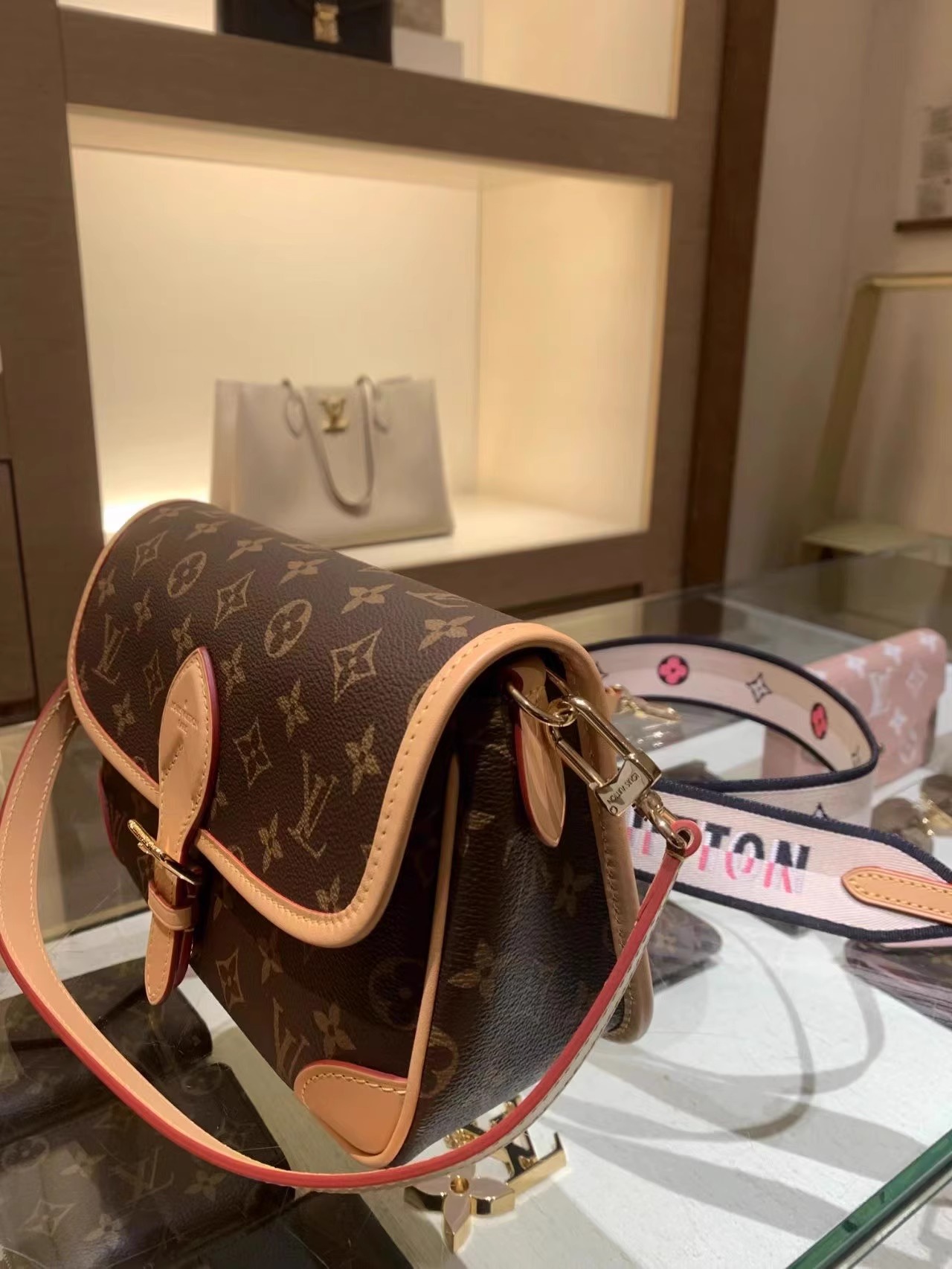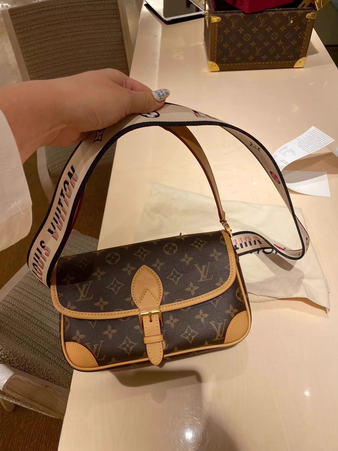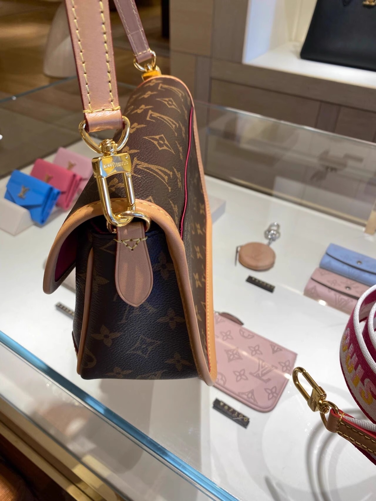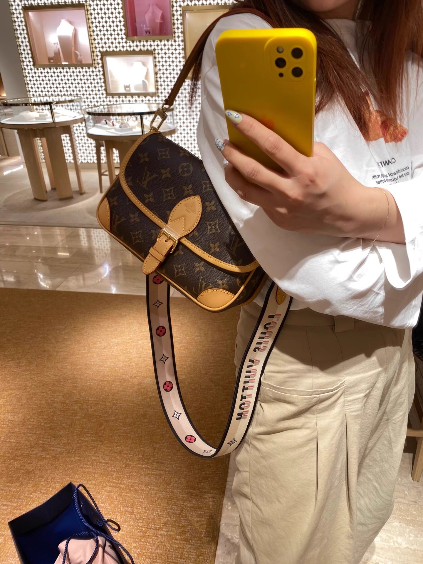 1990年代のクラシカルなモデルを再解釈して、モノグラム・キャンバスで仕上げたサッチェルバッグ「ディアヌ」。レザーのコーナー部分やアーカイヴから着想を得たバックルといったヴィンテージ風のディテールを、スマートなポケットと整理しやすい内装のモダンな機能と組み合わせました。エクスクルーシブな幅広のジャカード織りのストラップの片面には大胆な「Louis Vuitton」シグネチャーが、もう片面にはさりげないモノグラム・フラワー モチーフがあしらわれています。