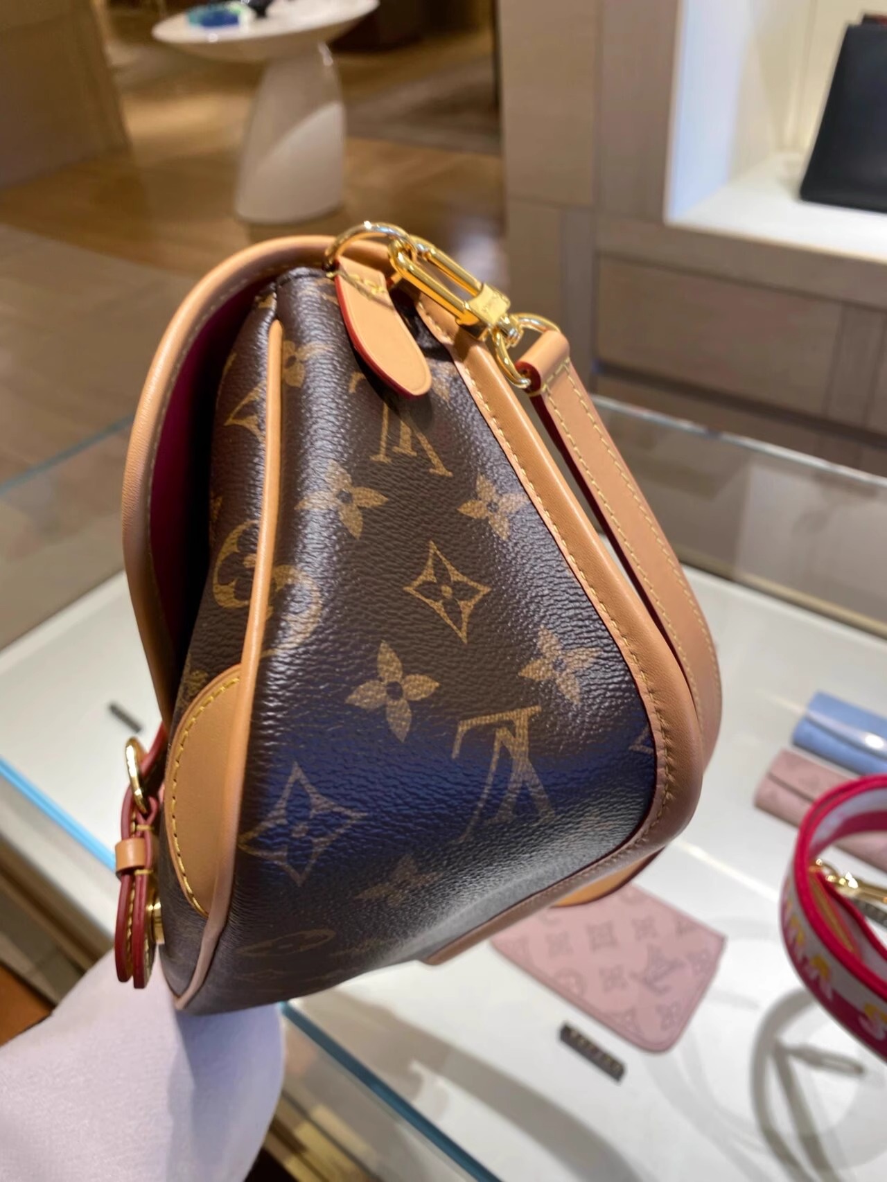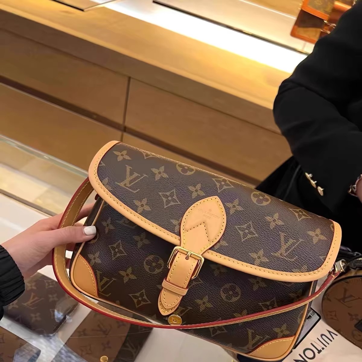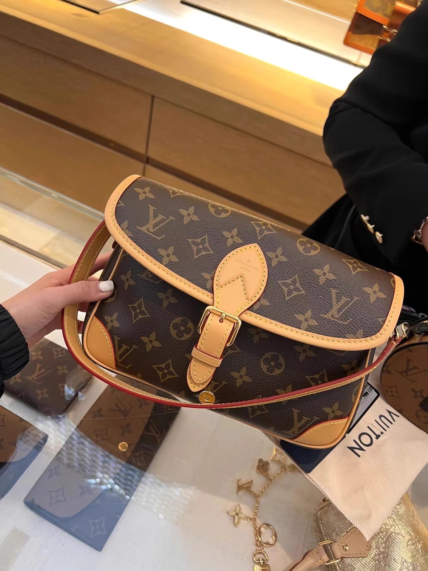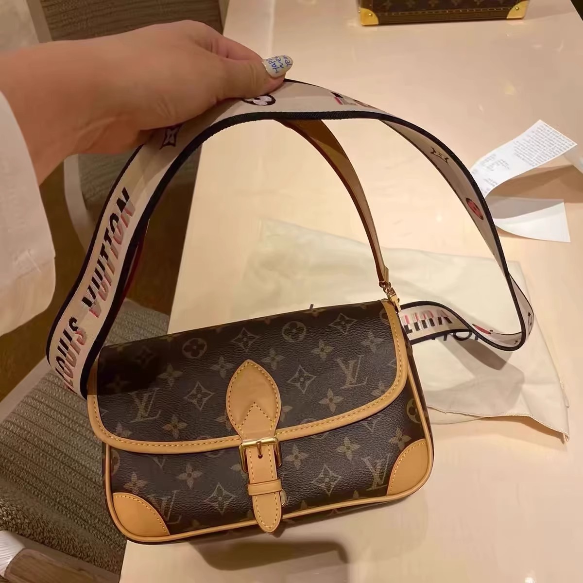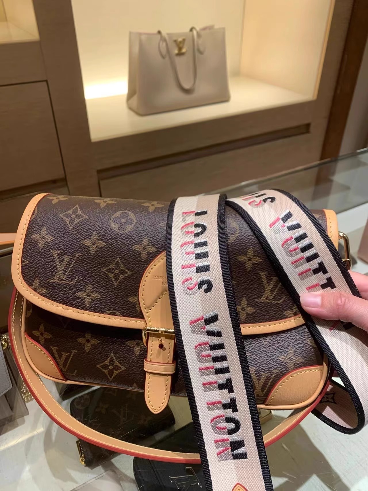 1990年代のクラシカルなモデルを再解釈して、モノグラム・キャンバスで仕上げたサッチェルバッグ「ディアヌ」。レザーのコーナー部分やアーカイヴから着想を得たバックルといったヴィンテージ風のディテールを、スマートなポケットと整理しやすい内装のモダンな機能と組み合わせました。エクスクルーシブな幅広のジャカード織りのストラップの片面には大胆な「Louis Vuitton」シグネチャーが、もう片面にはさりげないモノグラム・フラワー モチーフがあしらわれています。