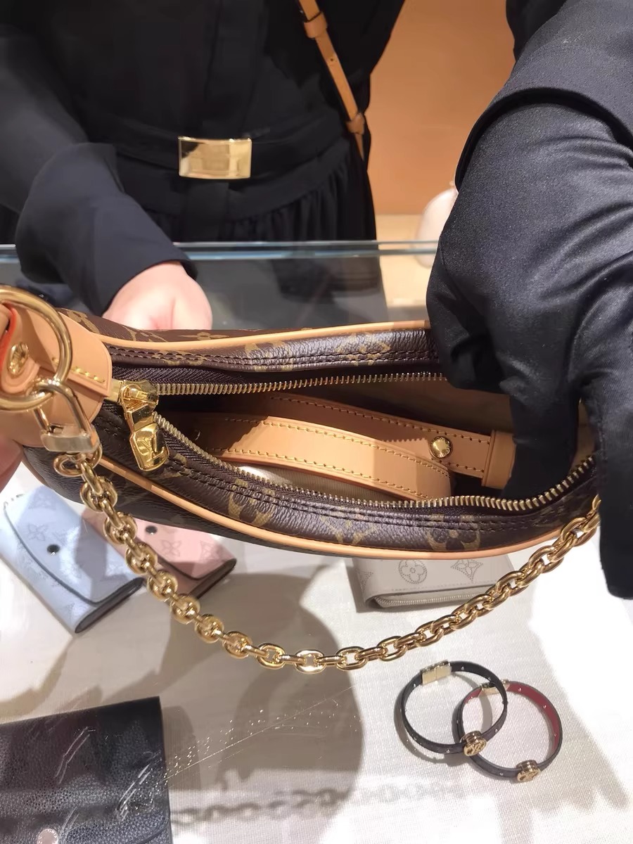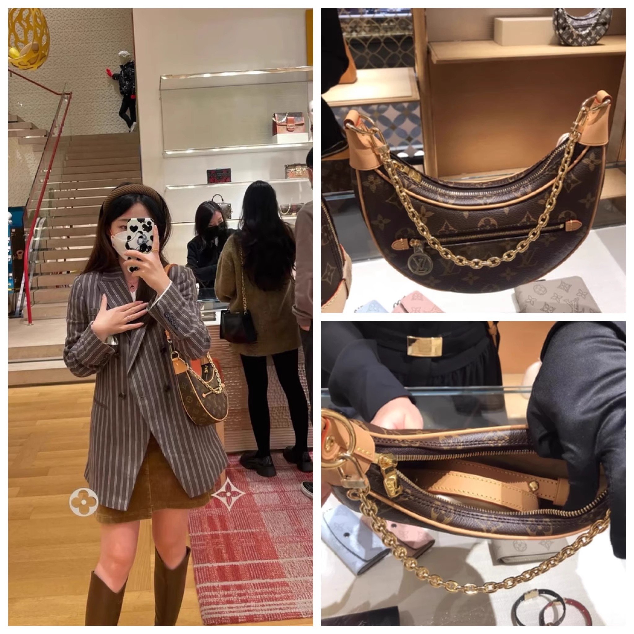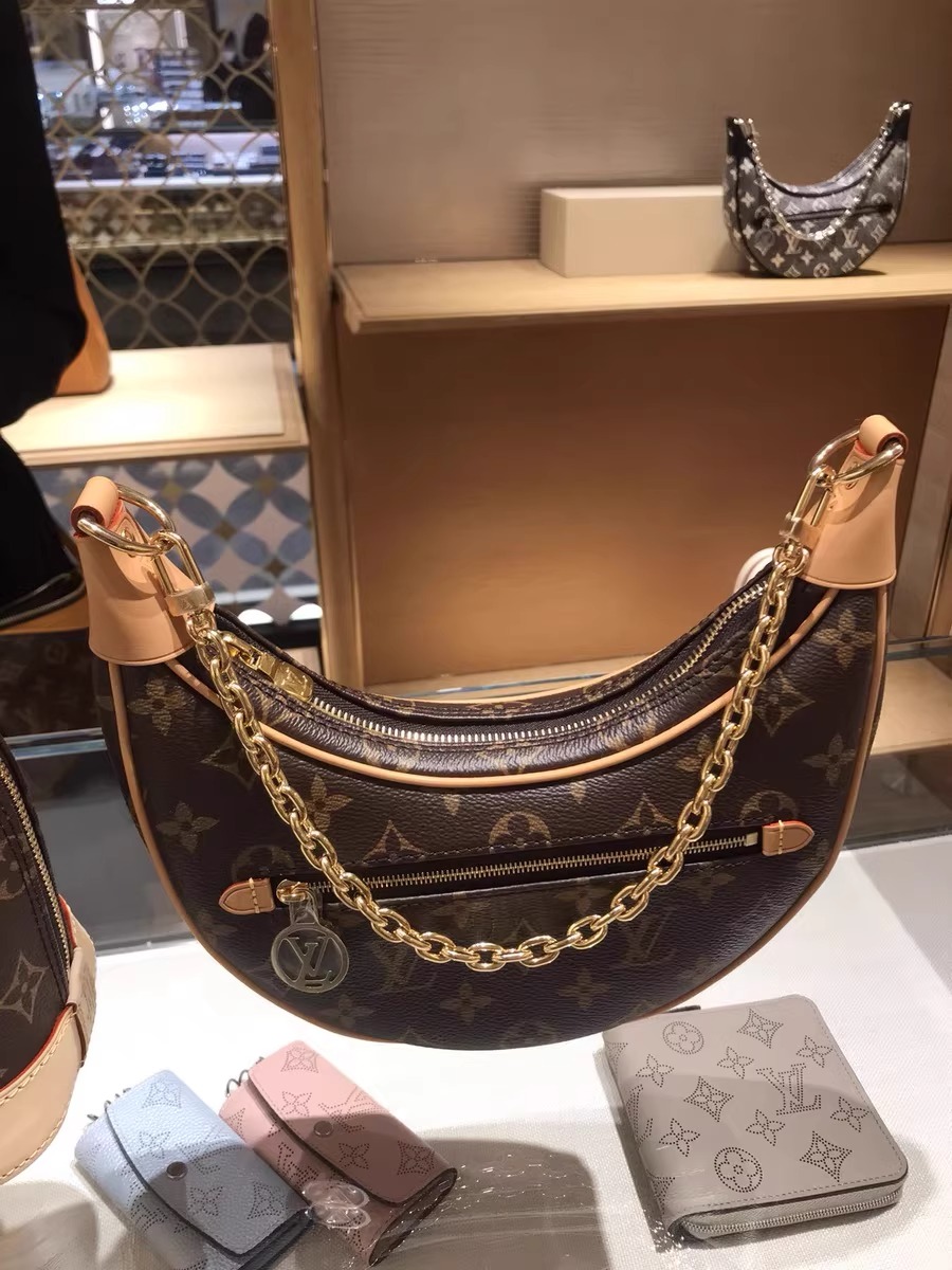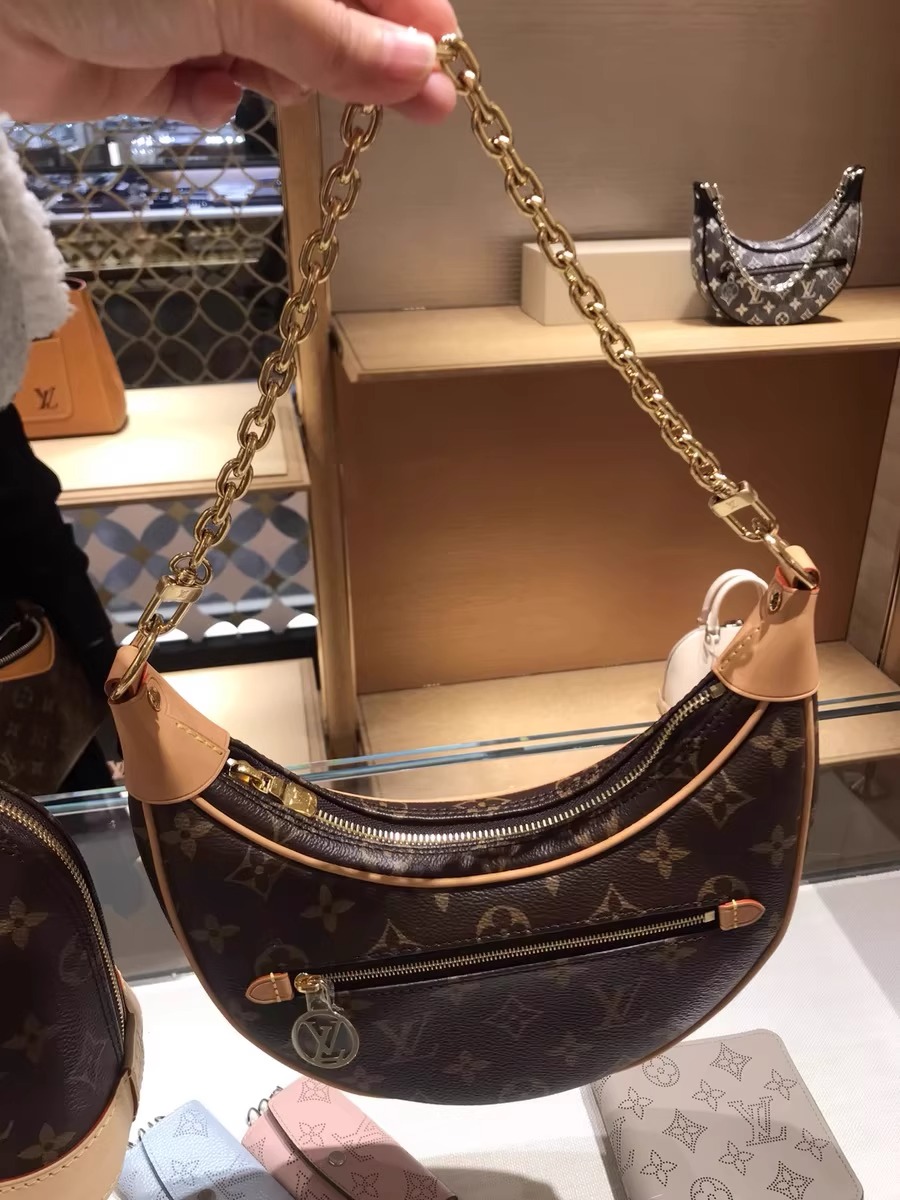 ニコラ・ジェスキエールが2022クルーズ・コレクションに相応しくデザインした「ループ」。メゾンのアーカイヴに残るバッグ「クロワッサン」から着想を得た半月型のバッグです。ボディフレンドリーなコンパクトなデザインに、ショルダーキャリー可能なチェーンと、クロスボディバッグとしても使用できるレザーストラップが付属しています。フロントのファスナー付きポケットには、LV サークルの引き手をあしらいました。