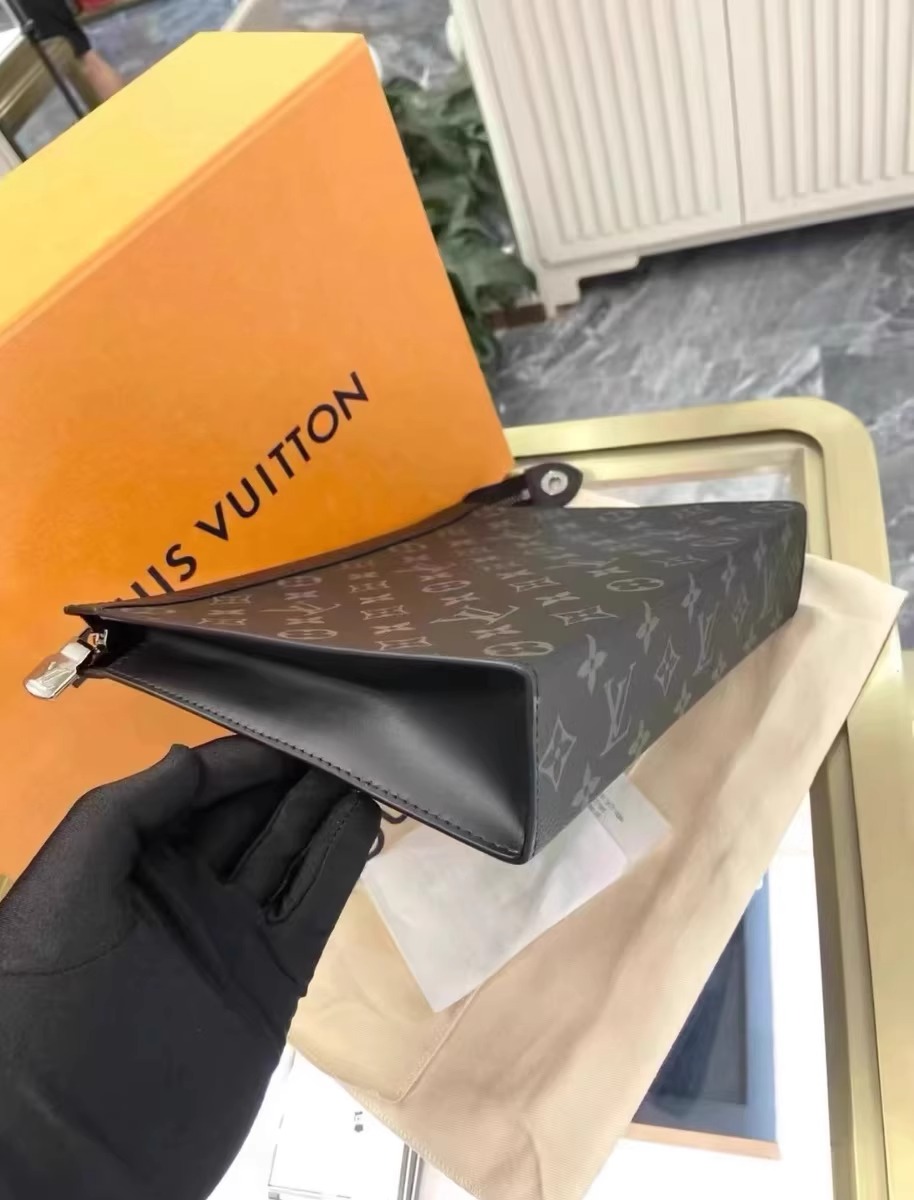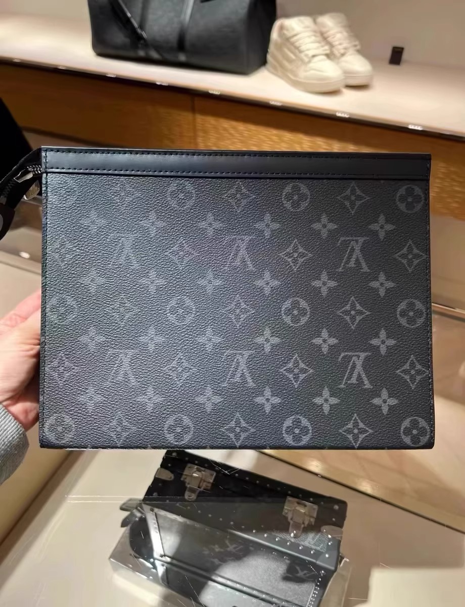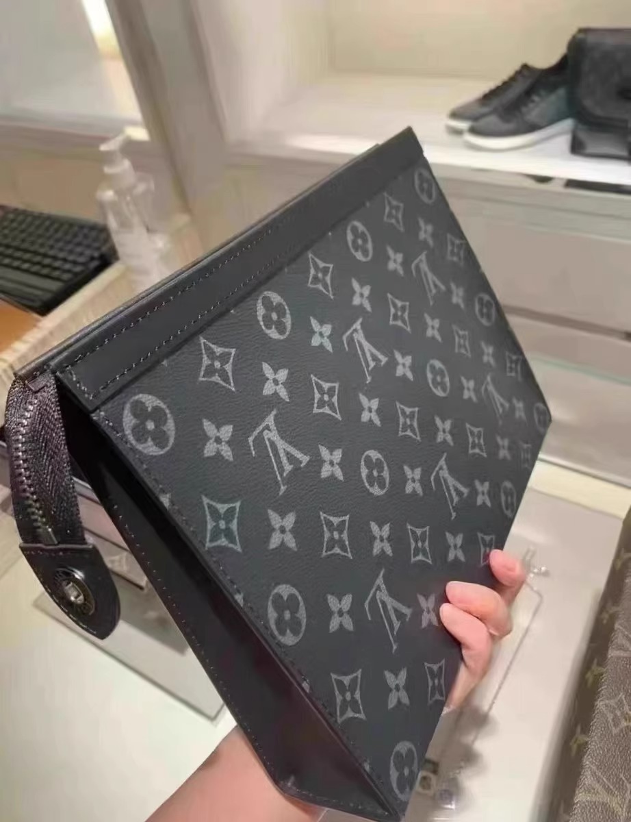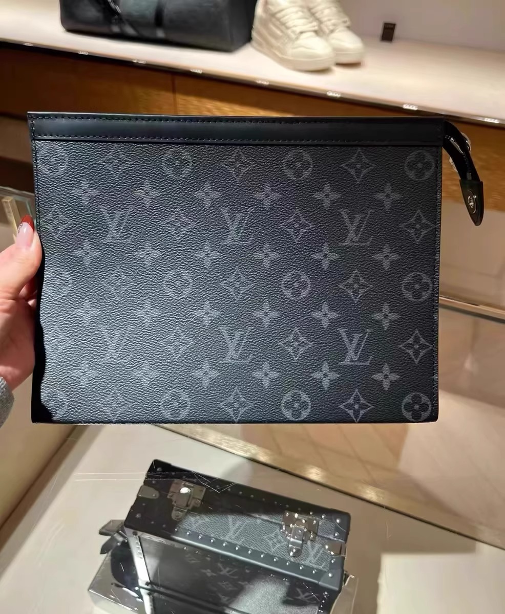 ブラックとグレーのアイコニックな新素材、モノグラム・エクリプス キャンバスで仕立てた「ポシェット・ヴォワヤージュ MM」。新しいサイズのマスキュリンなポーチは、トラベルバッグの中身を整理するのに最適です。