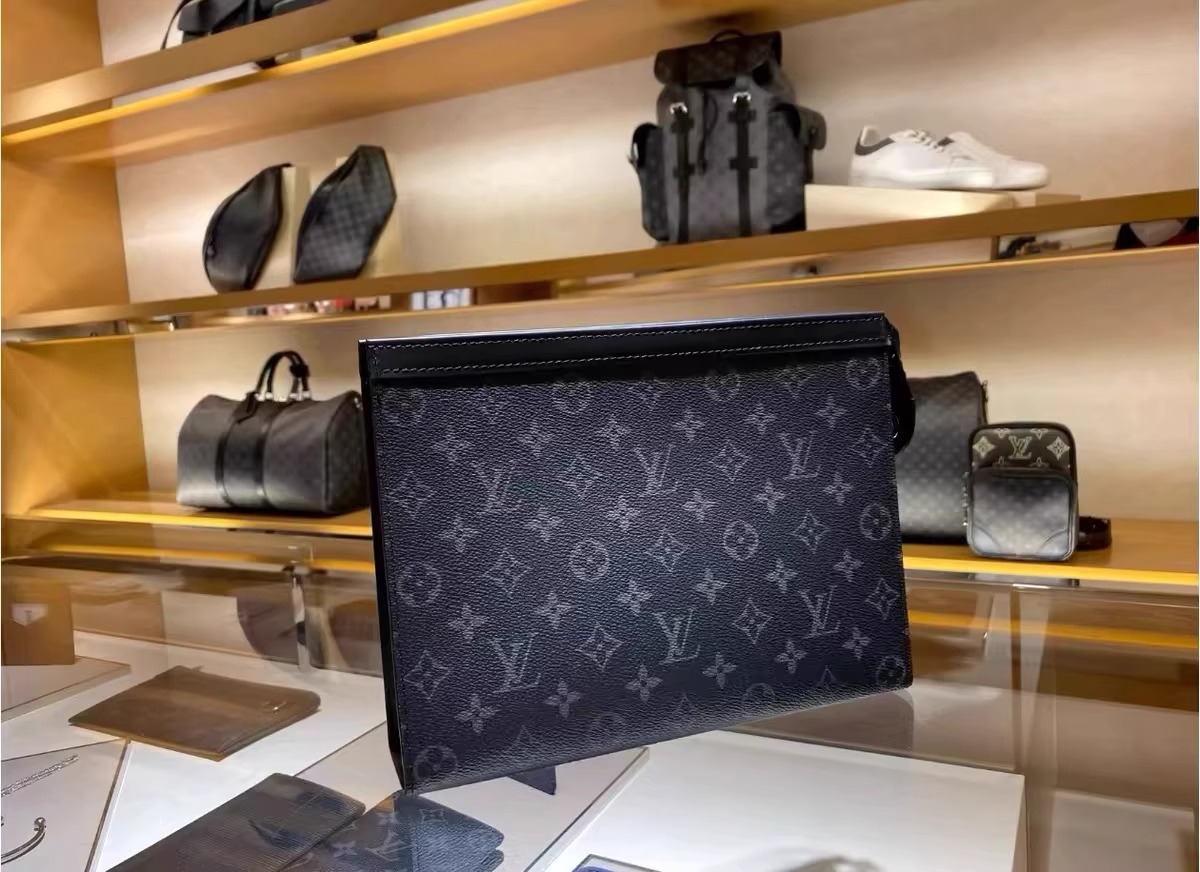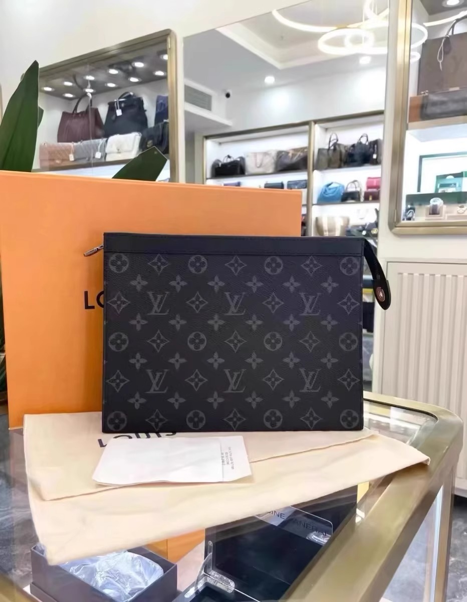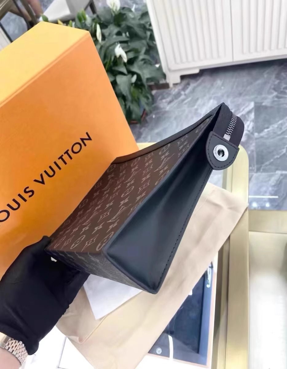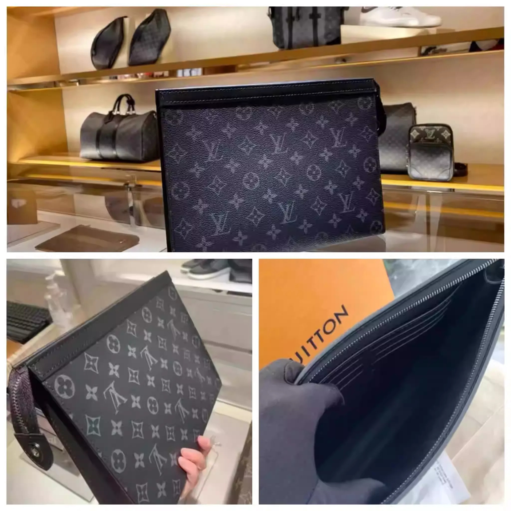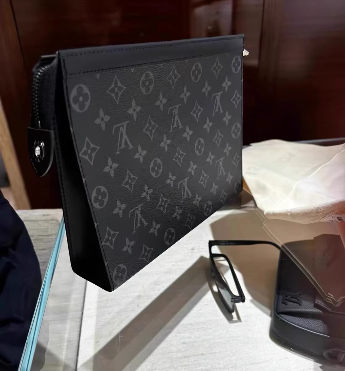 ブラックとグレーのアイコニックな新素材、モノグラム・エクリプス キャンバスで仕立てた「ポシェット・ヴォワヤージュ MM」。新しいサイズのマスキュリンなポーチは、トラベルバッグの中身を整理するのに最適です。
