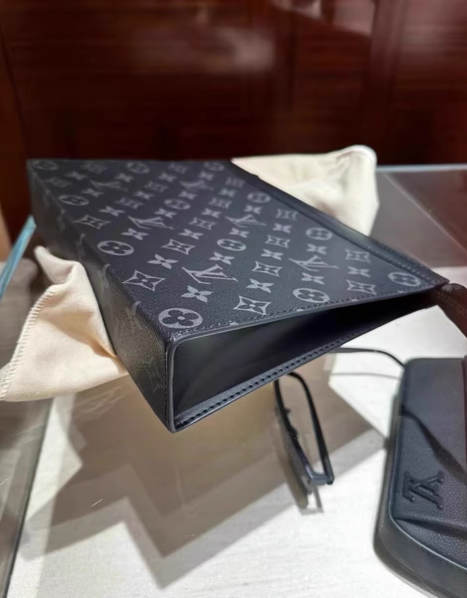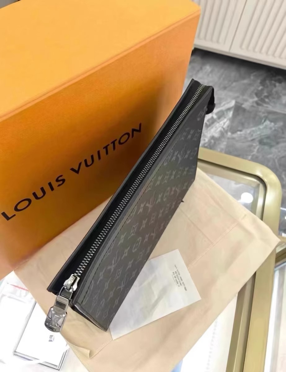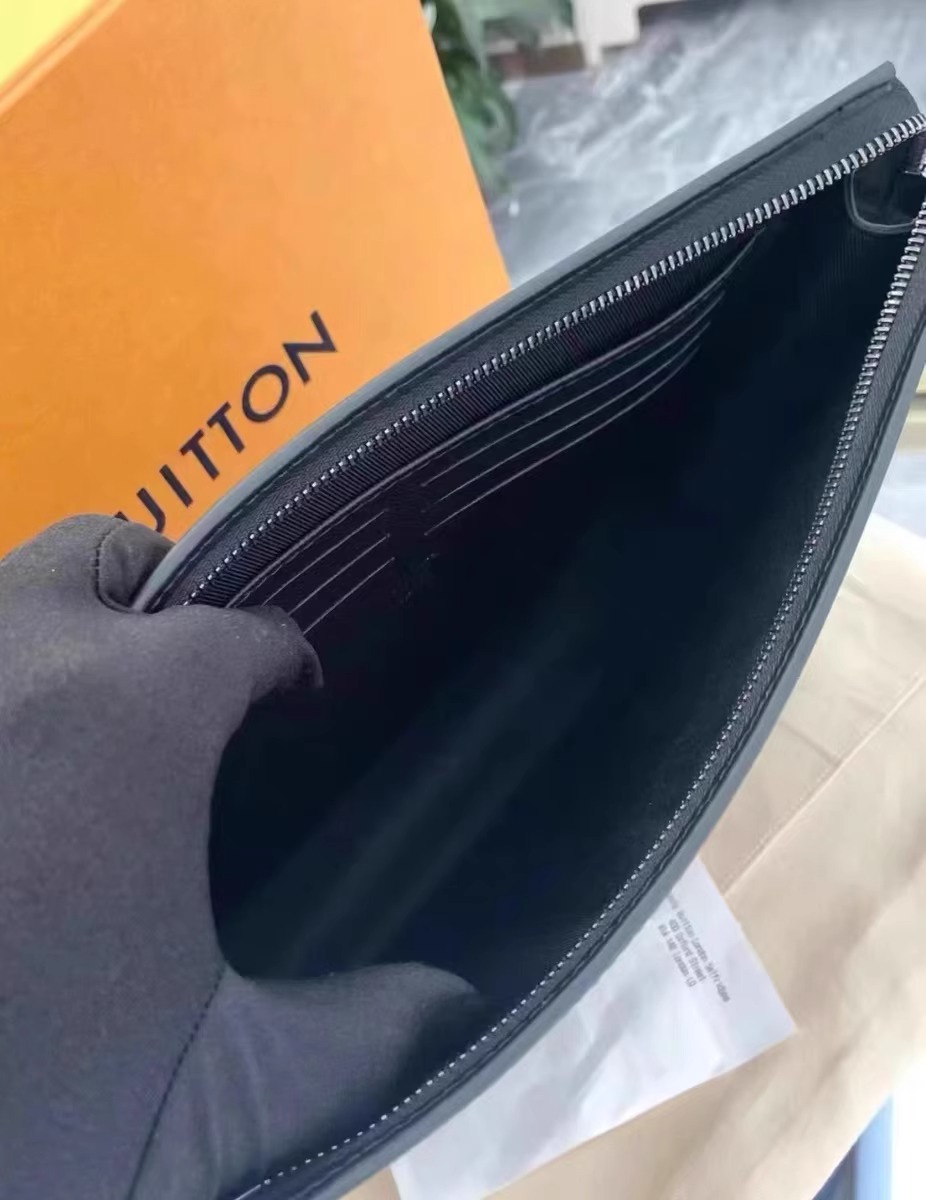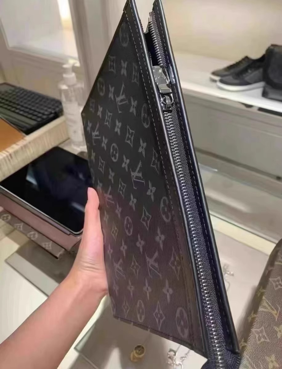 ブラックとグレーのアイコニックな新素材、モノグラム・エクリプス キャンバスで仕立てた「ポシェット・ヴォワヤージュ MM」。新しいサイズのマスキュリンなポーチは、トラベルバッグの中身を整理するのに最適です。